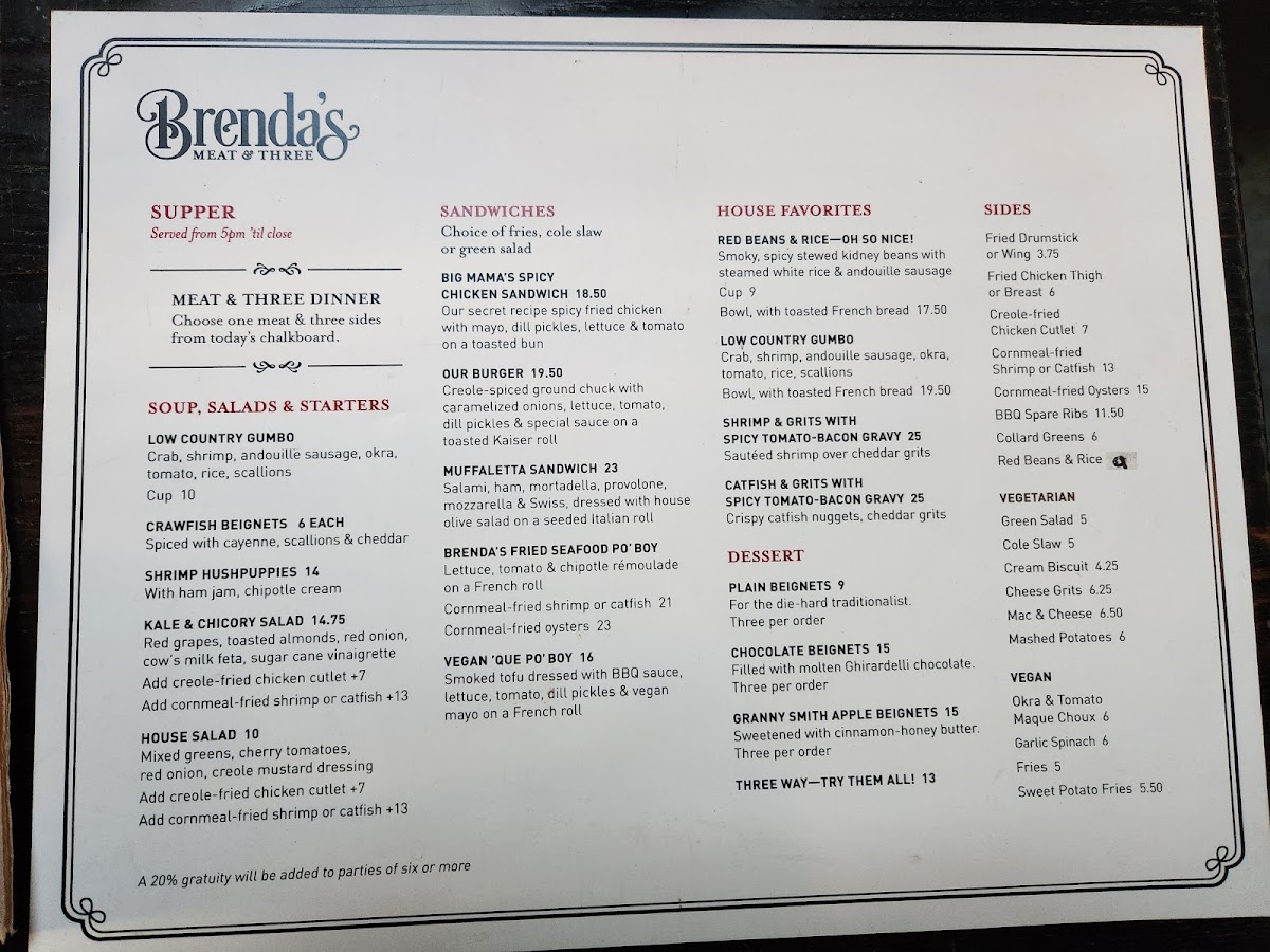 “ All of the stars aligned when our group of 9 were able to grab dinner at Brenda’s (despite not having a reservation)!! We initially resigned on having to do takeaway - but magically all the seating at the bar opened up (this was also within the last hour of opening)!! The food was absolutely delicious, generously portioned, and clearly made with a lot of love and care. My sister in law absolutely LOVED the Low Country Gumbo, my husband loved the meatloaf and cheesy grits, and I really loved the Our Burger, the fried chicken which was well seasoned and crispy to perfection!!! As one would hope, the sides had us full of lots of ummms and aaaaaaas - and you would be remiss if you visit and don’t try the mac and cheese & collard greens! All of their team were super friendly, and answered all our questions. The restaurant has a super cozy and trendy vibe, and I would say this is a must-visit for anyone craving authentic soul food done right!! ”